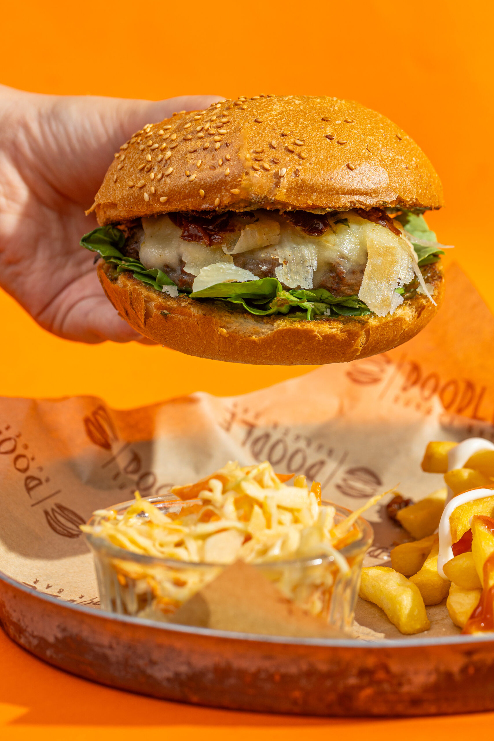 Steak haché pur Boeuf, mozzarella, parmesan, tomates séchées, roquette, sauce pesto